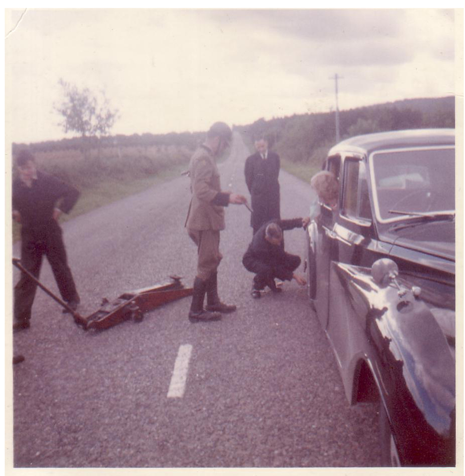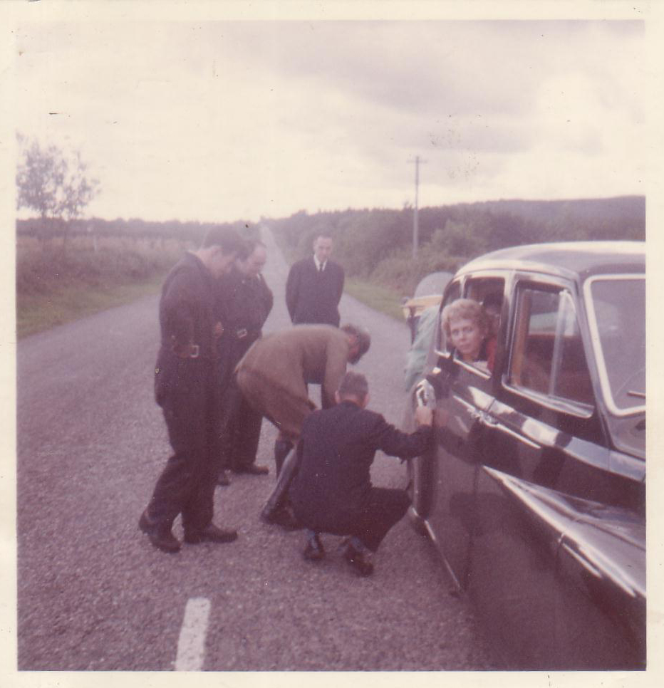 9-16-62 Near Cork - A flat- state tropper helps- the man with the jack finally got the car lifted & a new tire was put on the car
