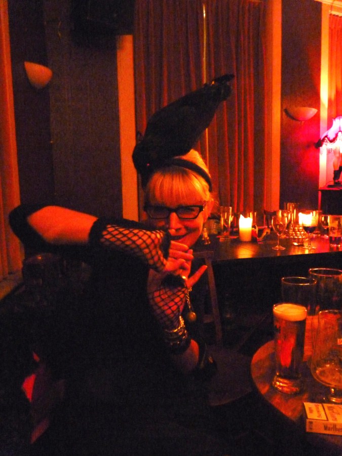 Pamina Caruso Brassey with Bird on her head Halloween 31 October 2012