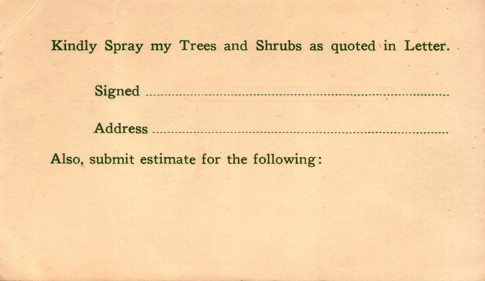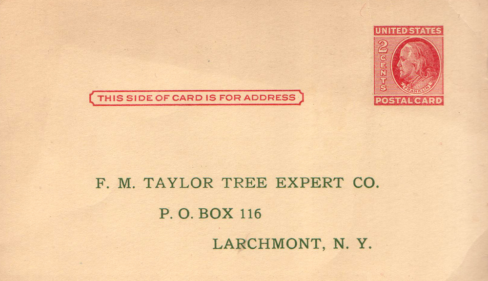 Old reply card for F.M Taylor Tree Expert Co PO Box 116 Larchmont, NY